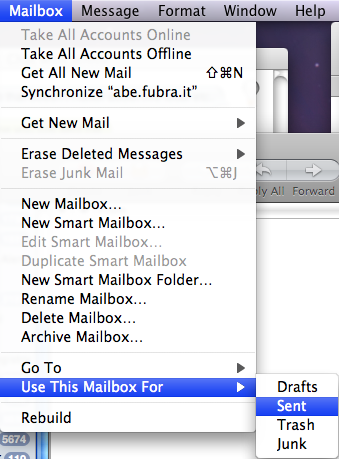 To set the Sent folder to be pointed at the correct Sent Items folder, you must select that folder from the account tree, and then select Mailbox > Use This Mailbox For > Sent.