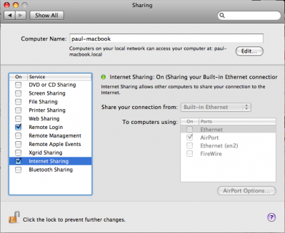 - Tick the Internet Sharing checkbox to enable it. By default, the network will be named after your computer's hostname. E.g. mine is called paul-macbook